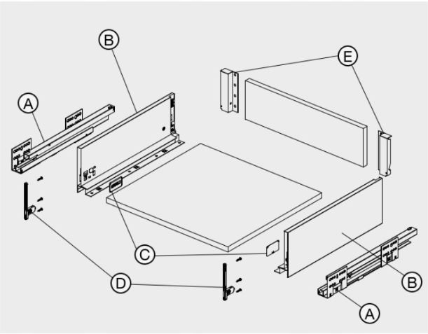 Komplet składa się z metalowych boków w kolorze antracytowym i kompletu prowadnicy z pełnym wysuwem. Dno i ściankę tylną szuflady należy dorobić w własnym zakresie. Zaletą jest to fakt, że wymiary dna oraz pleców jak i otworowanie na froncie oraz boku mebla jest identyczne jak chociażby w szufladach marki Blum Tandem Box czy GTV Axis Pro.