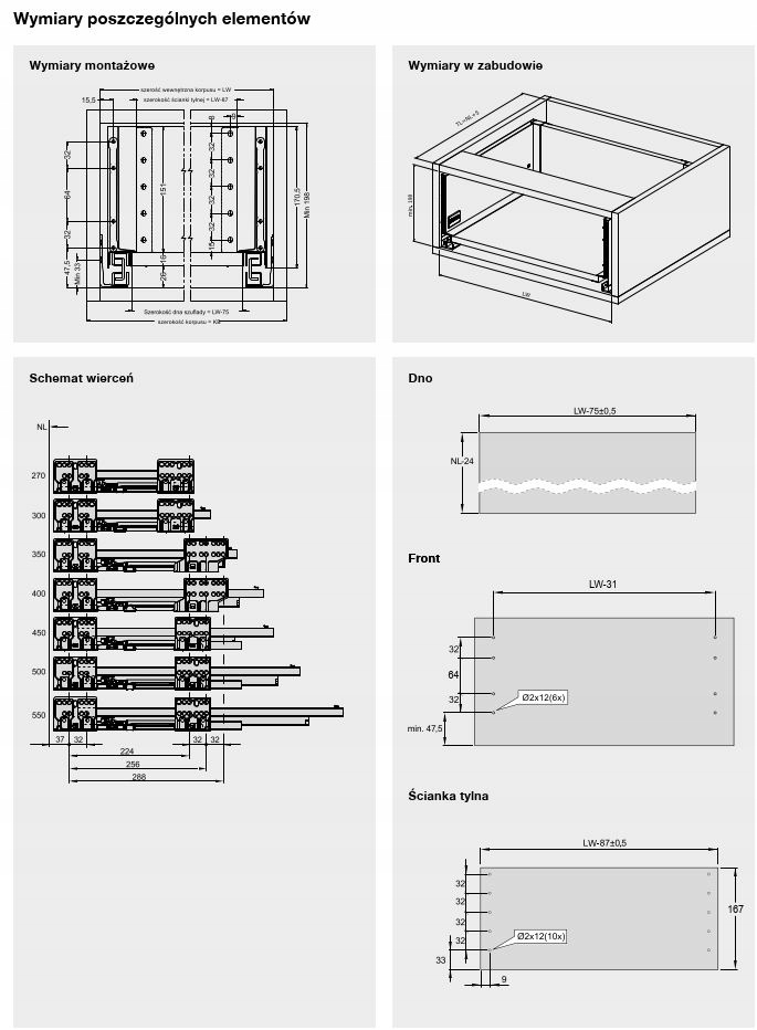 Komplet składa się z metalowych boków w kolorze białym i kompletu prowadnicy z pełnym wysuwem. Dno i ściankę tylną szuflady należy dorobić w własnym zakresie. Zaletą jest to fakt, że wymiary dna oraz pleców jak i otworowanie na froncie oraz boku mebla jest identyczne jak chociażby w szufladach marki Blum Tandem Box czy GTV Axis Pro.